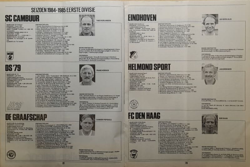 – op twee pagina’s overzicht van de spelersselecties van Cambuur, DS’79, De Graafschap, Eindhoven, Helmond Sport en FC Den Haag