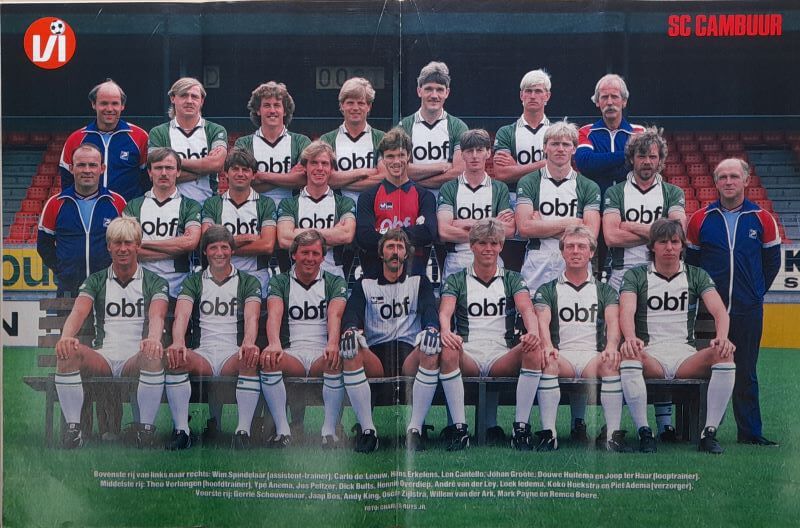 – in het midden een elftalposter van Cambuur met daarop Wim Spindelaar, Carlo de Leeuw, Hans Erkelens, Len Cantello, Johan Groote, Douwe Huitema, Joop ter Haar, Theo Verlangen, Ype Anema, Jos Peltzer, Dick Bults, Hennie Overdiep, André van der Ley, Loek Iedema, Koko Hoekstra, Piet Adema, Gerrie Schouwenaar, Jaap Bos, Andy King, Oscar Zijlstra, Willem van der Ark, Mark Payne, Remco Boere