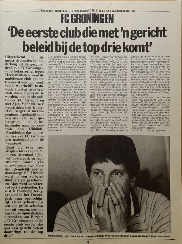 – reportage over FC Groningen – “De eerste club die met een gericht beleid bij de top drie komt” – een reportage met Renze de Vries, Han Berger