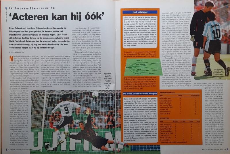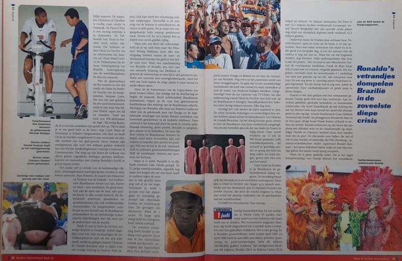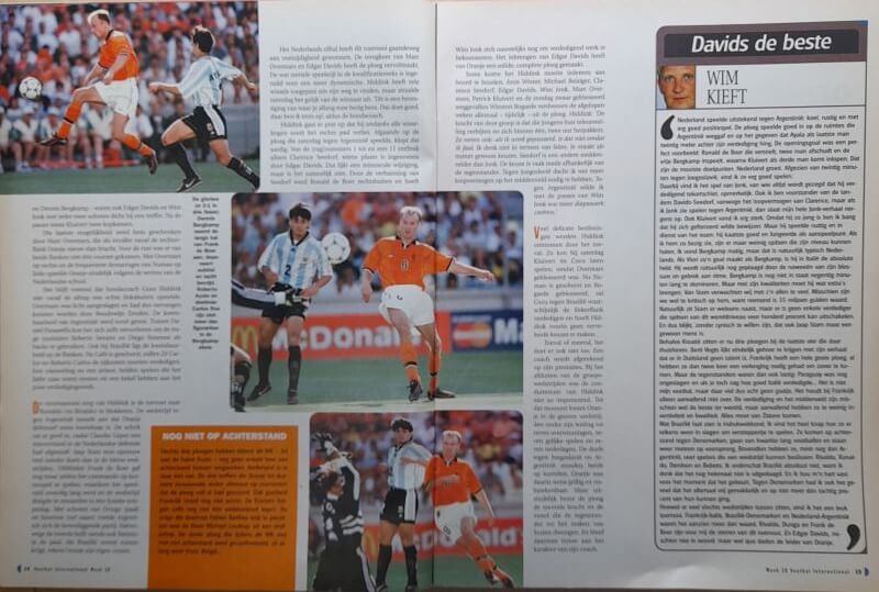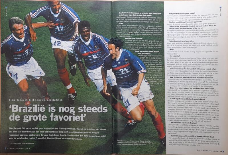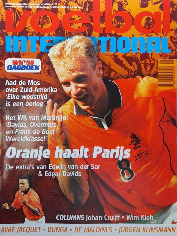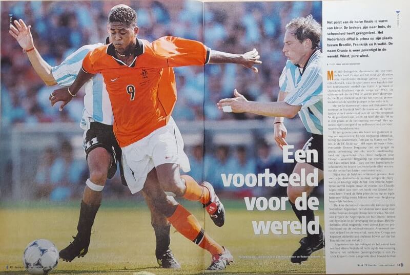 In deze oude VI weer veel over de WK 1998 te Frankrijk met de kwartfinales van onder meer Nederland – Argentinië, Duitsland – Kroatië en Brazilië – Denemarken. Verder vind je in de oude Voetbal International van 7 juli 1998 onder andere de volgende artikelen: