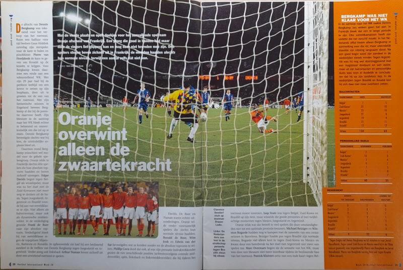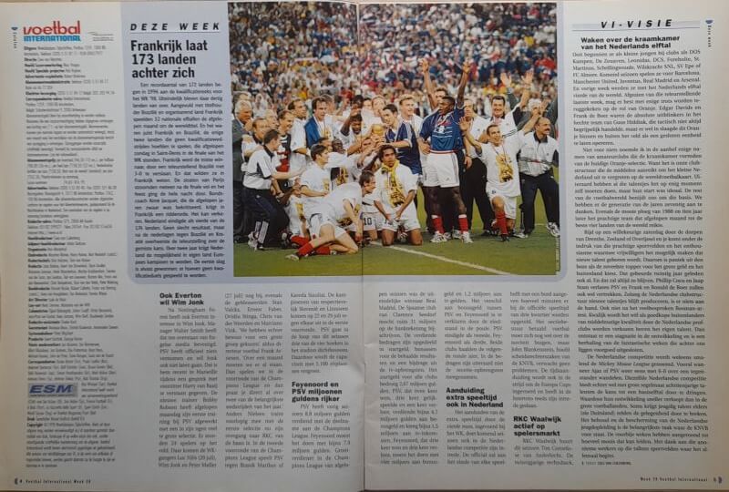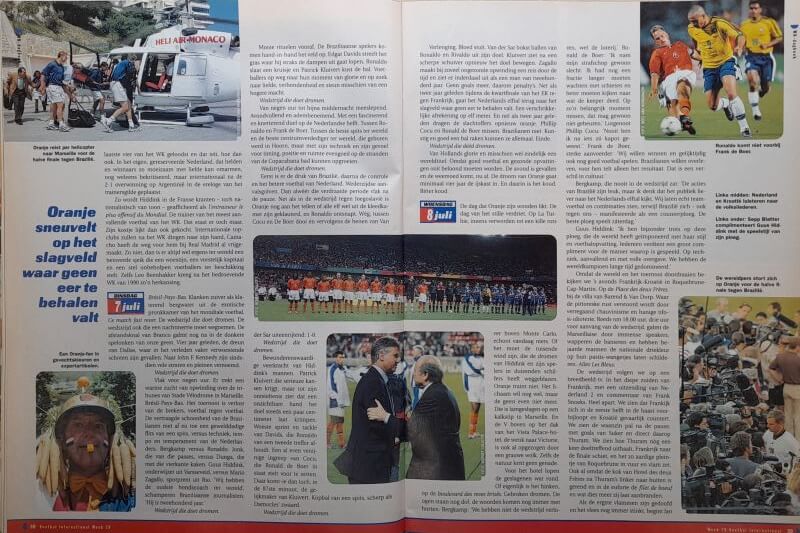 In deze oude VI vind je een complete terugblik op het WK 1998 te Frankrijk met interviews met Dick Advocaat en Guus Hiddink + vele kenners over het Nederlands Elftal. Verder vind je onder meer het volgende in de oude Voetbal International van 15 juli 1998: