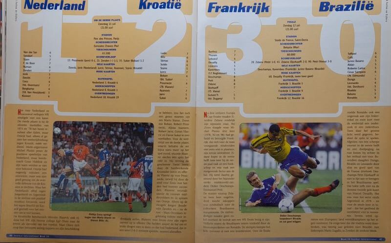 – korte wedstrijdverslagen en statistieken van Brazilië – Nederland 1-1, Frankrijk – Kroatië 2-1, Nederland – Kroatië 1-2, Frankrijk – Brazilië 3-0